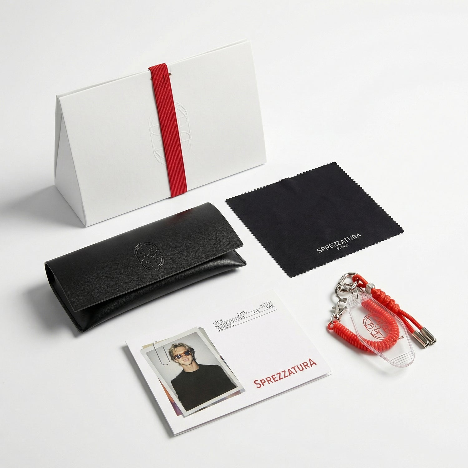 The sunglasses will come in a faux leather with a monogram on the flap and a Sprezzatura sunglass cleaner. A special greeting card with a message from the founder will be tucked inside the unique triangular box. You will also receive the Sprezzatura bag charm to carry with you wherever you go.